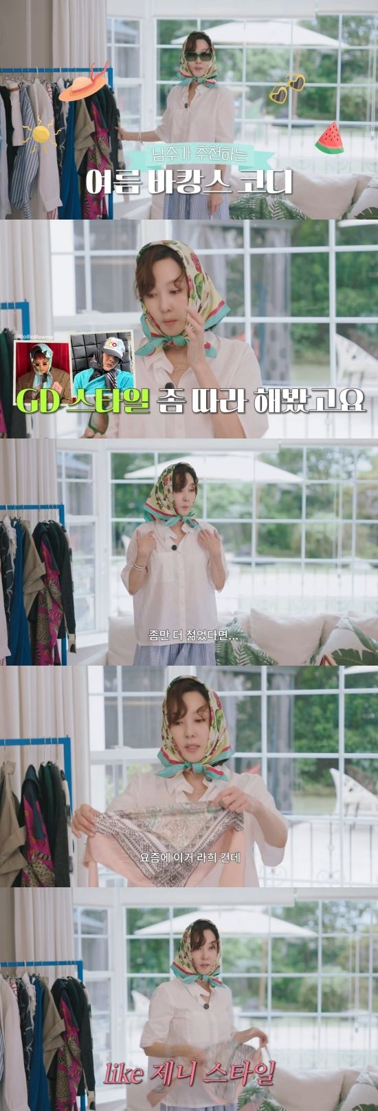 이날 김남주는 시청자들에게 여름 바캉스 룩을 추천했다. 명품 스카프와 선글라스로 자신을 꾸민 김남주는 "저는 스카프를 이렇게 처음 써 봤다. 요즘에 용기가 생겼다. 지드래곤이 쓴 뒤로 많은 사람들이 (스카프를) 쓰더라"라고 덧붙였다.