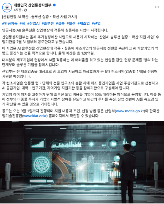 산업부는 올해 제2회 추가경정예산 사업으로 신규 추진하는 '산업AI 솔루션 실증·확산 지원' 사업의 수행기관을 오는 31일부터 9월 1일까지 공모한다고 30일 밝혔다.