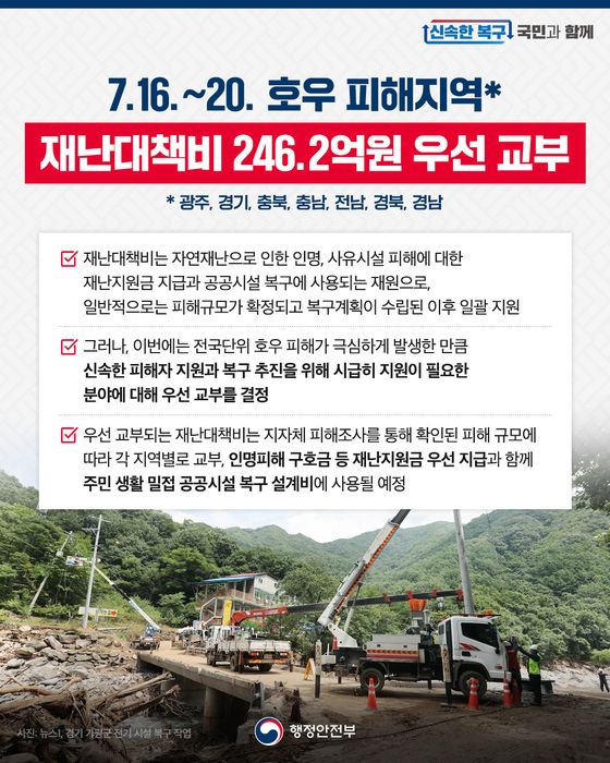 행정안전부는 7월 집중호우로 피해가 발생한 지역인 광주, 경기, 충북, 충남, 전남, 경북, 경남에 재난대책비 246억 2000만 원을 우선 교부한다고 30일 밝혔다.
