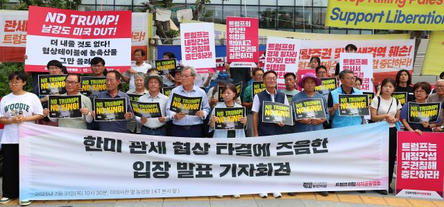 농민단체 연대체인 '농민의길'과 트럼프위협저지공동행동은 이날 서울 종로구 주한미국대사관 옆에서 기자회견을 열고 "끝날 때까지 끝난 게 아니다. 현재 합의되지 않은 것을 포함해 추가 협상이 있을 것으로 예상된다"며 "방위비, 방위비 등의 트럼프 대통령의 요구는 명백한 내정 간섭"이라먀 이같이 밝혔다.