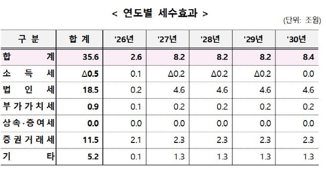 이번 세법개정에서 항목별 세수효과(순액법)를 보면 법인세율 환원이 가장 크고, 이어 △증권거래세율(0.20%·2조 3000억원) △금융보험업자에 대한 교육세 과세체계 개편(수익금액 1조원 초과 구간 교육세율 1.0%·1조 3000억원) △임시투자세액공제 운영 종료(3000억원) △주식 양도세 대주주 기준 강화(10억원↑·2000억원) 순이다.