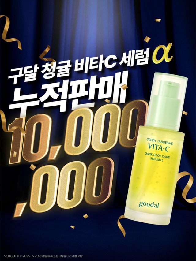 클리오의 고기능 클린 자연주의 스킨케어 브랜드 구달의 스테디셀러 ‘청귤 비타C 잡티 케어 세럼 알파’가 출시 이래 전체 제품 누적 판매량 1000만 병을 돌파하며, 국내 잡티케어 시장에서의 굳건한 입지를 다시 한 번 입증했다. 맑고 균일한 피부톤과 잡티 개선에 대한 소비자들의 높은 관심, 그리고 제품력에 대한 신뢰가 더해져 이뤄낸 성과다.