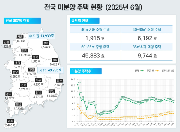 이와 함께 준공 전 미분양 주택도 5개월 연속 감소했다. 지난달 6만 3,734가구로 전월보다 4.4% 줄었다. 수도권 미분양은 1만 3,939가구로 8.9%, 지방은 4만 9,795가구로 3.1% 각각 줄었다.
