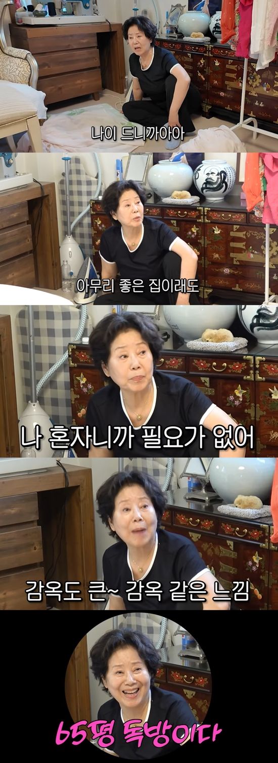 이어 그는 "나이 들고 혼자니까 좋은 집이 필요 없다. 큰 감옥 같은 느낌이다"라며 불편을 토로했다. 이에 제작진은 자막으로 "65평 독방이다"라고 밝혀 웃음을 자아냈다.