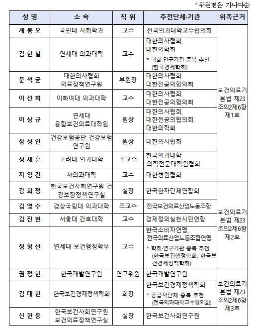 총 15명의 위원 중 공급자단체 추천위원은 8명, 수요자단체 추천위원은 4명, 학회·연구기관 추천위원은 3명으로, 보건의료기본법에 따라 공급자단체 추천위원을 과반수로 구성했다. 위원장은 추후 학회·연구기관 추천위원 중 호선할 예정이다.