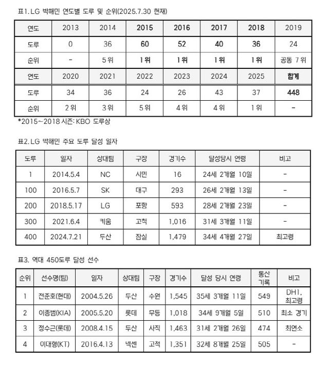 또한, 7월 31일 현재 35세 5개월 7일인 박해민은 450도루를 달성하게 되면 종전 전준호(전 현대)의 기록을 경신하게 된다.