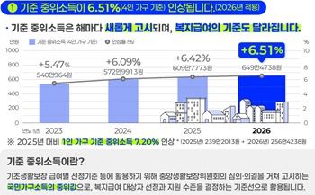 2026년도 기준 중위소득은 4인 가구 기준으로 전년 대비 39만 6,965원이 인상된 649만 4,738원으로 결정됐다.