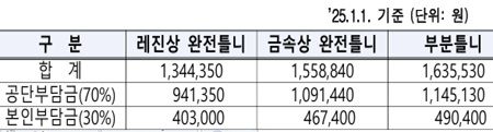 지원금액은 요양급여비용 총액의 70%로 레진상 완전틀니 94만 1,350원, 금속상 완전틀니 109만 1,440원, 부분틀니 114만 5,130원이다.