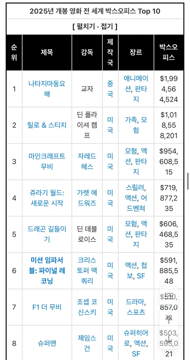 전세계 25년 개봉작 중 흥행순위 6위