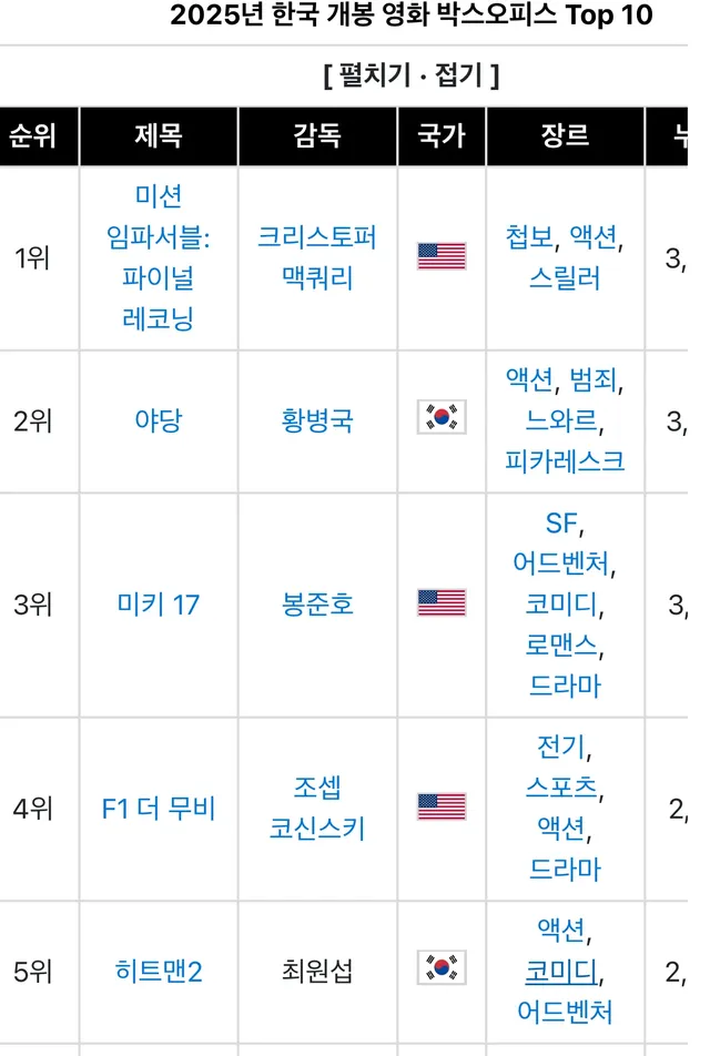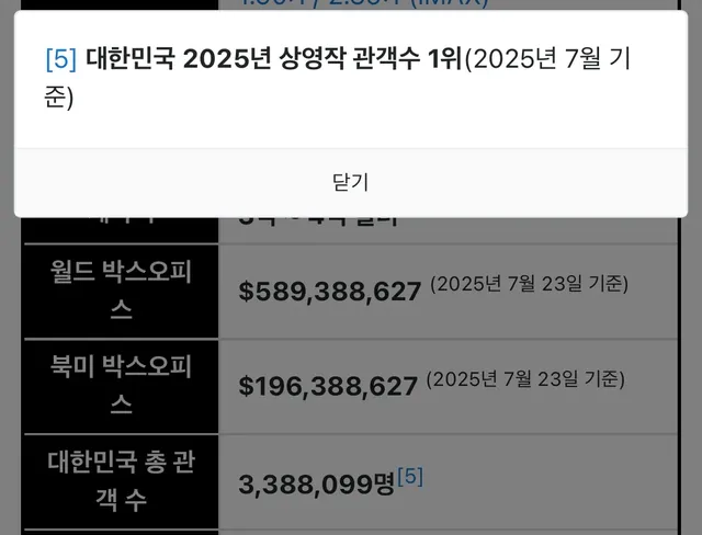 우리나라로는 25년 7월까지 개봉작 중 관객수 1위를 굳건히 지키는중