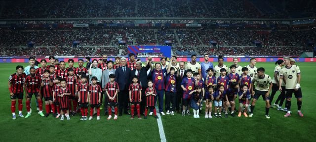 | 31일 서울월드컵경기장에서 열린 FC바르셀로나 2025 아시아투어 에디션 FC서울과 FC바르셀로나의 경기. 양 팀 선수와 관계자들이 기념촬영을 하고 있다. 사진=연합뉴스 |