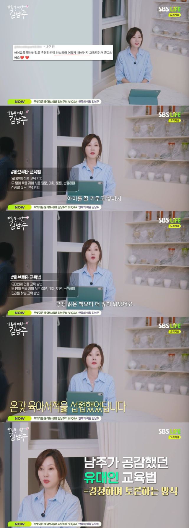 이날 한 시청자는 "아이 교육 잘하신 거로 유명하신데, 하브루타 어떻게 하셨는지 교육적인 거 듣고 싶다"며 김남주의 교육법을 궁금해했다.