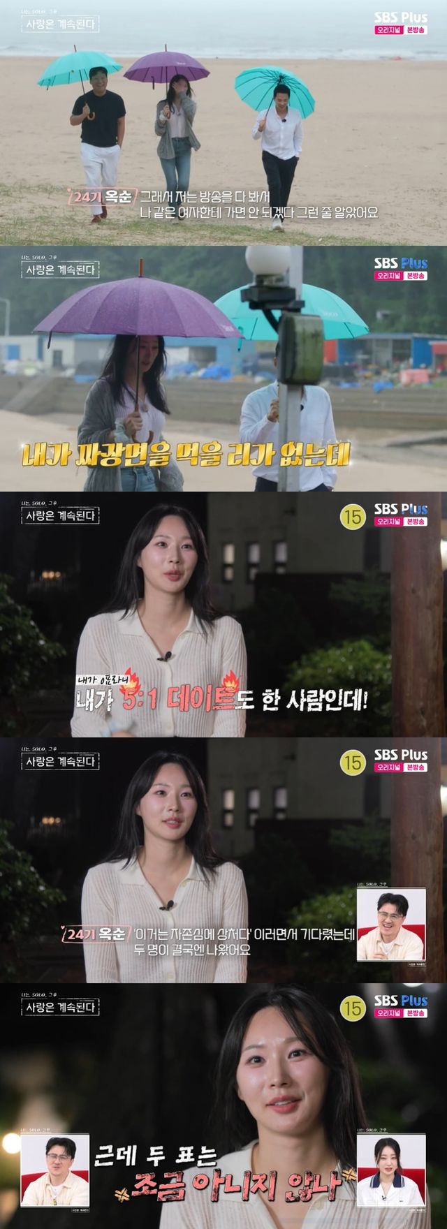 앞서 24기 옥순은 남성 출연자들의 늦은 등장에 0표를 받은 줄 알았다고. 그는 "저는 방송을 다 봐서 '나 같은 여자한테 가면 안 되겠다' 그런 줄 알았다. 그래서 '저 짜장면 먹나요?' 물어보려고 했다. '내가 짜장면을 먹을 리가 없는데' 이러면서"라며 너스레를 떨었다.