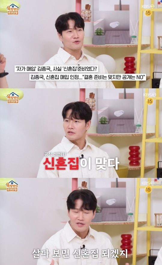 뉴시스 보도에 따르면, 김종국은 지난달 31일 방송한 KBS 2TV '옥탑방의 문제아들'에서 60억원대 고급빌라 관련 "나중에 결혼하면 당연히 신혼집이 될 것"이라고 밝혔다. MC 김숙이 "신부는? 누가 있는 거냐"고 묻자, 김종국은 "누가 있는 게 아니고, 결혼하면 신부가 들어와야 한다"고 답했다.