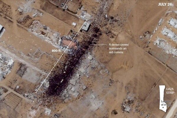 뉴시스 보도에 따르면, 지난달 31일(현지시각) 뉴욕타임스에 따르면 28일 위성사진 업체 플래닛랩스는 가자지구로부터 320km 떨어진 위성이 이틀 전 포착한 수백 명의 팔레스타인인들이 구호품 차량을 향해 몰려드는 장면을 공개했다.