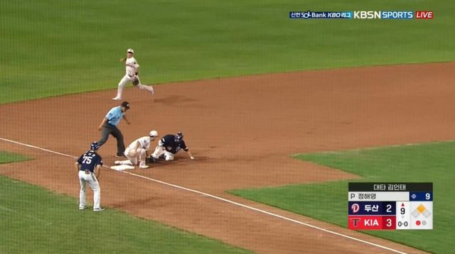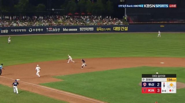 승리로 가는 과정은 험난했다. KIA는 1-1로 맞선 6회 초 양의지에게 좌월 솔로 홈런을 맞았다. 최근 불안한 불펜 상황을 고려하면 '치명적인 실점'이었다. 하지만 6회 말 1사 후 김선빈·최형우·나성범의 3연속 안타로 2-2 동점을 만든 뒤 2사 1·3루에서 터진 변우혁의 중전 적시타로 앞섰다. 불펜 총력전으로 1점 차를 지킨 KIA는 9회 초 마무리 투수 정해영으로 굳히기에 들어갔다. 그런데 정해영은 선두타자 박준순에게 우익수 방면 2루타를 허용하며 위기에 몰렸다.
