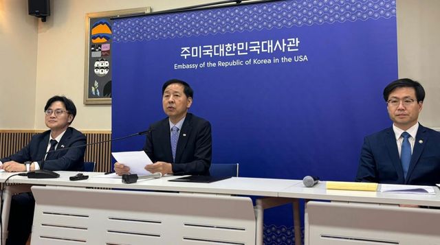 30일(현지 시간) 미국 워싱턴 주미한국대사관에서 구윤철 경제부총리 겸 기획재정부 장관(가운데)이 김정관 산업통상자원부 장관(왼쪽), 여한구 산업부 통상교섭본부장(오른쪽)과 함께 한미 통상협의 결과를 설명하고 있다. 뉴시스