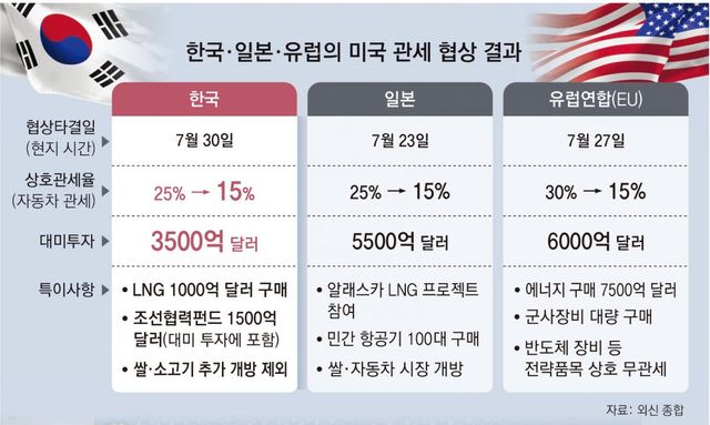 앞서 일본은 미국으로 수출되는 일본산(産) 자동차 품목 관세를 25%에서 12.5%로 낮췄다. 기존의 기본관세 2.5%를 더해 총 15%의 관세를 부과받게 된 것이다. 이에 우리 정부는 한미 FTA에 따라 기존 한국산 자동차가 무관세로 미국에 수출돼 온 점을 강조하며 한국 자동차도 품목 관세가 12.5%로 인하돼야 한다고 주장했다. 그러나 트럼프 행정부는 일본, EU와 같은 관세율(기본관세 합산)인 15%를 고집했다는 게 정부 협상단의 설명이다. 한국 자동차 업계로서는 한미 FTA 효과가 사라지면서 기존에 누리던 2.5%포인트의 관세율 우위를 빼앗기게 된 셈이다. 그러면서 트럼프 대통령은 자신의 소셜네트워크서비스(SNS)에 “한국에 대한 관세는 15%로 합의했다”면서 “미국은 (한국으로 수출할 때) 관세를 물지 않을 것”이라고 했다.