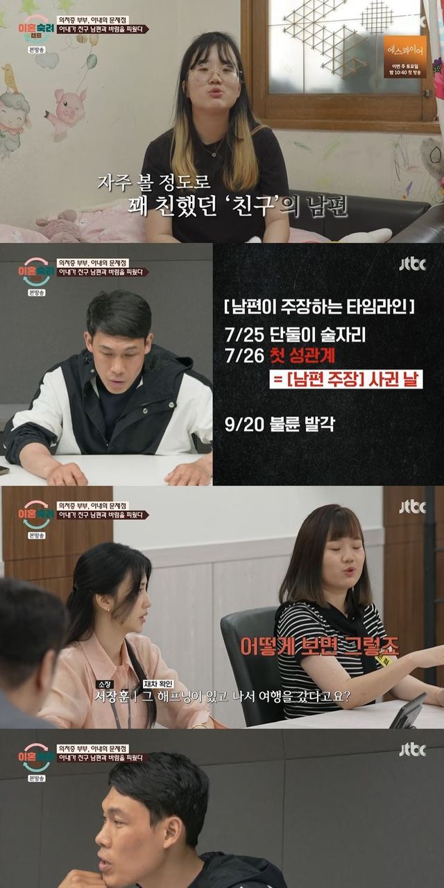 아내는 "원래 친구 남편한테 존대를 했는데 (단둘이 술을 마신 뒤) 반말도 하고 친한 오빠, 동생으로 이야기를 했다"면서 "실수로 하룻밤에 생긴 일이다. 시작은. 둘 다 그런 말을 했다. 없던 일도 하자고. 왜 거기까지 넘어갔는지도 모르겠다"고 말했다.