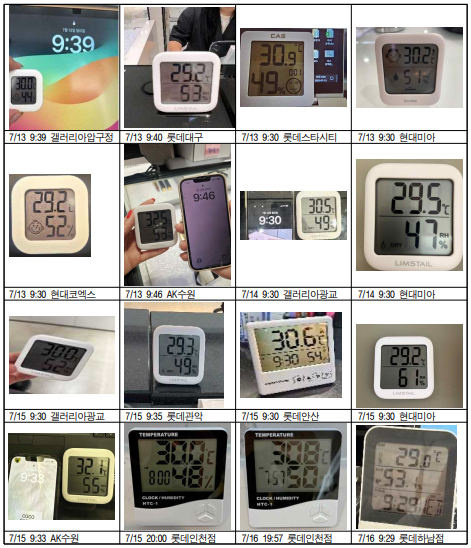 일부 공간은 더 열악했다. 노조가 공개한 조합원들의 실내온도 측정 사진을 보면, 16개 공간의 영업준비 시간 실내온도가 29도를 넘었고, 최고 온도를 기록한 곳은 30.9도였다.