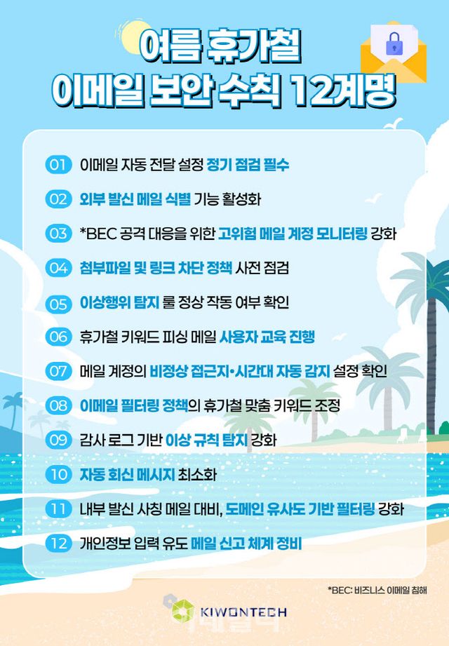 기원테크 김동철 대표는 “여름 휴가철은 임직원들의 경계심이 느슨해지고 보안 관리 체계가 일시적으로 약화하는 시기로, 사이버 공격자들이 가장 선호하는 타이밍”이라며 “이번에 공개한 12계명은 기업들이 휴가철에도 안전한 이메일 환경을 유지할 수 있도록 실무진이 즉시 적용 가능한 구체적인 가이드라인을 제시한 것”이라고 말했다.