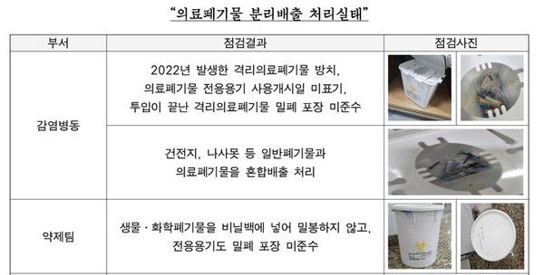 또 감염 병동은 전용 용기에 사용 개시일을 표기하지 않고 투입이 끝난 전용 용기를 밀폐 포장하지 않았다. 건전지, 나사못 등 일반 폐기물과 의료 폐기물을 혼합 배출했다.
