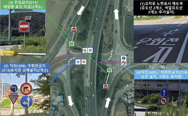 처인구는 해당 지역에서 운전자에게 정확한 정보를 전달하고 사고를 예방하기 위해 ▲교차로 내 색깔유도선 마련 ▲좌회전 방향 차량유도선 도색 ▲진입금지 표지판 이설 ▲불필요한 표지판 제거 ▲교차로 노면표시 재도색 등의 교통안전시설물을 신설하거나 정비했다.