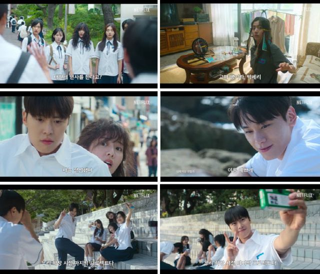 함께 공개된 티저 예고편은 “내 머리는 꼬이기 시작했고 내 인생 또한 꼬이기 시작했다”라는 세리의 내레이션과 함께, 아빠에게 물려받은 곱슬머리처럼 꼬여만 갔던 세리의 고백의 순간들이 빠르게 지나가며 시선을 사로잡는다. 자칭, 타칭 짝사랑 고백 전문가인 세리는 서울에서 온 전학생 윤석(공명 분)을 비롯한 친구들과 함께 자신이 첫눈에 반한 학교 최고 인기남 김현(차우민 분)에게 마음을 전하기 위한 일생일대의 짝사랑 고백 대작전을 계획한다. 우연히 마주친 김현이 인사를 건네자 순간 얼어버리고, 김현이 좋아하는 생머리를 만들기 위해 드라이기부터 책받침까지 온갖 방법을 총동원하는 모습은 유쾌한 웃음을 자아내며 세리의 귀엽고 발랄한 매력을 한껏 드러낸다. 한편, 전학 오자마자 얼떨결에 세리의 고백 대작전에 동참하게 된 윤석은 세리와의 미묘한 케미스트리를 자아내며, 두 사람이 펼칠 예측 불가능한 첫사랑 로맨스에 대한 호기심을 자극한다. 여기에 더해진 “꼬불꼬불 열아홉 세리의 두근두근 고백 대작전”이라는 카피는 짝사랑을 고백하기 위해 고민하던 그 순간의 떨림을 다시 느끼게 하며 누구나 공감할 수 있는 풋풋한 러브 스토리를 기대하게 한다. 뿐만 아니라, 김현, 백성래(윤상현 분)를 비롯한 세리의 친구들이 전하는 싱그러운 에너지부터 카세트, 필름 카메라, 캠코더 등 90년대의 몽글몽글한 향수를 자극하는 레트로한 소품들까지. ‘고백의 역사’ 만의 다채롭고 청량한 매력은 올여름 우리의 마음을 설렘으로 물들일 것이다.