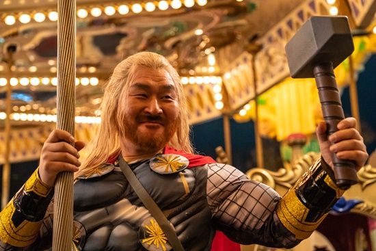 좀비가 돼버린 딸 수아(최유리 분)의 기억을 되살리기 위해 가장 좋아했던 장소인 놀이공원에 함께 가기로 한 정환(조정석)과 동배(윤경호). 놀이공원 입장 할인을 받기 위해 토르 코스프레를 한 채 등장한 동배의 압도적인 비주얼은 '좀비딸'의 넘버원 웃음 버튼이다.