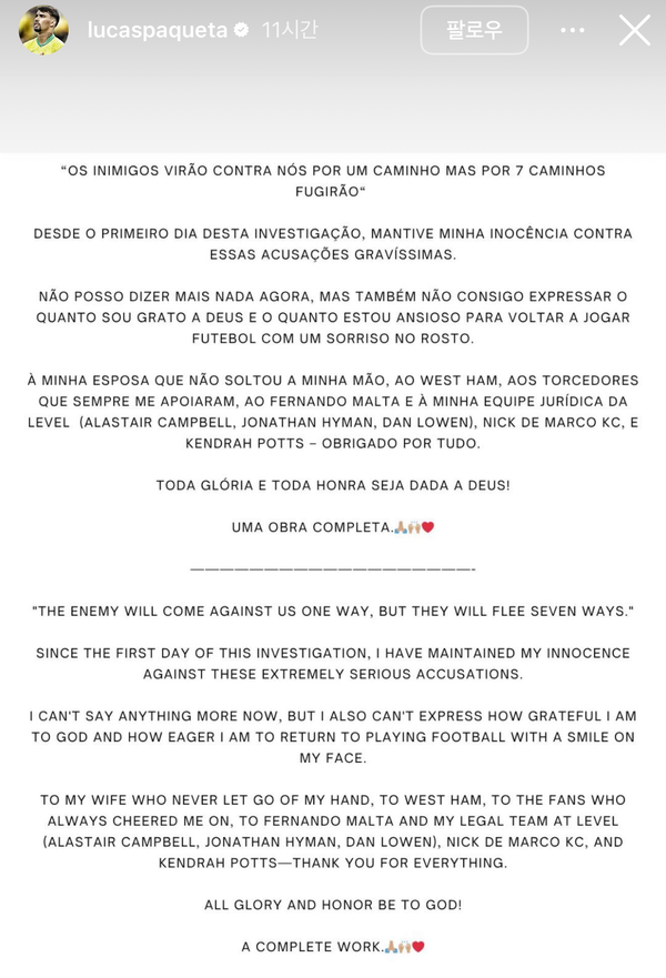 1일(한국시간) 영국 ‘BBC’ 등 현지 복수 매체는 “웨스트햄유나이티드의 미드필더 루카스 파케타는 잉글랜드축구협회(FA)의 조사가 시작된 지 2년 만에 독립규제위원회에 의해 승부조작 혐의에서 벗어났다”라고 보도했다.