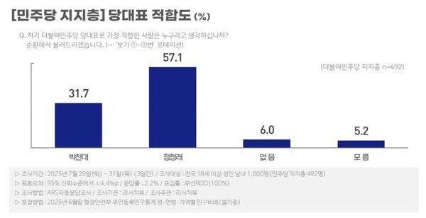 여론조사전문기관 리서치뷰가 지난 7월 29일부터 31일까지 전국 만 18세 이상 성인 남녀 1000명 중 민주당 지지층 492명을 대상으로 민주당 차기 당대표로 누가 가장 적합한지 물은 결과 정청래 후보 57.1%, 박찬대 후보 31.7%로 집계됐다.