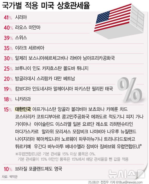 이에 따라 협상이 타결되지 않은 67개국에 대해서는 미국으로 수출되는 상품에 15~41%의 관세가 부과된다.
