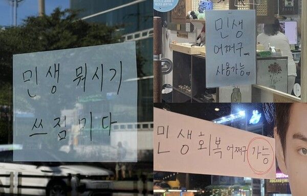 뉴시스 보도에 따르면, 1일 복수의 온라인 커뮤니티와 소셜미디어(SNS)에서는 '민생 뭐시기 쓰짐미다(써집니다)'라는 안내문이 붙은 가게 사진이 퍼지며 누리꾼들의 웃음을 자아냈다. '민생 (회복) 어쩌구 사용 가능'이라는 문구가 붙은 또 다른 가게 사진도 함께 공유됐다.