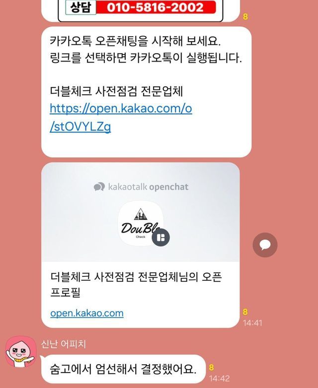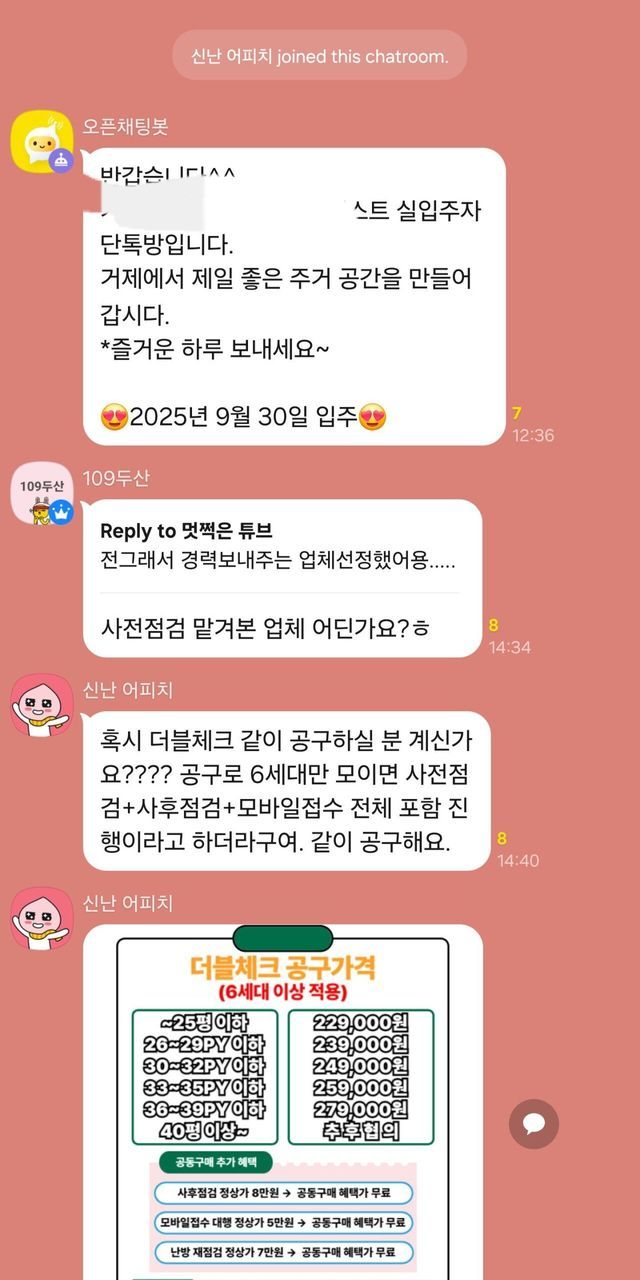 사건의 발단은 이렇다. 어느 날 갑자기 '신난 어피치'라는 닉네임의 한 입주민(?)이 특정 사전점검 업체를 엄청나게 추천하기 시작함. '더블체크'라는 곳인데, 자기가 알아봤다면서 공동구매하면 싸다고 계속 바람을 잡는 거임.(들어오자마자 저럼, 한두번 저런것도아님)
