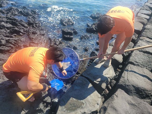 지난달 28일 제주 서귀포시 표선해수욕장에서 소방 대원이 해파리 수거활동을 벌이고 있다. / 제주도 소방안전본부 제공