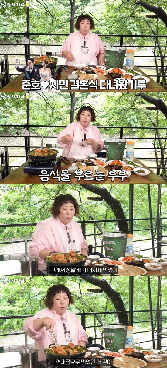 신기루는 "정말 배가 터지게 먹었다. 그날 역대급으로 먹은 것 같다. 호화로운 결혼식이었다"라며 결혼식 식사에 만족감을 드러냈다.