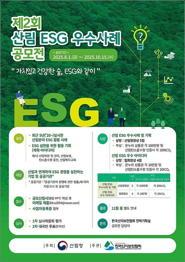 산림청은 오는 10월 15일까지 국내기업 및 공공기관들을 대상으로 산림분야와 연계된 지속가능한 사회공헌활동을 발굴하는 '산림 ESG 우수사례 공모전'을 개최한다고 1일 밝혔다.