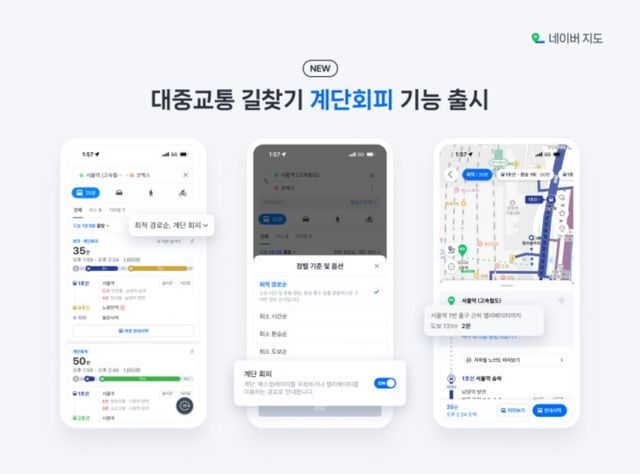 네이버 지도는 대중교통 길찾기 기능에 ‘계단회피 경로’ 옵션을 새롭게 추가했다고 1일 밝혔다. 이 기능은 엘리베이터가 설치된 출입구 및 환승 정보를 반영해 이용자가 계단을 이용하지 않고도 목적지까지 안전하고 편리하게 이동할 수 있도록 지원한다.