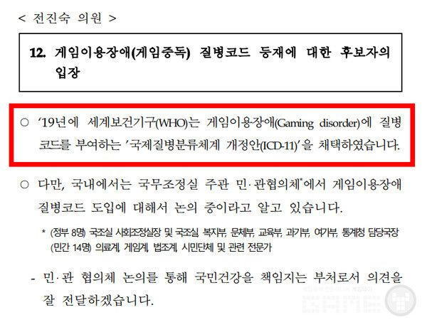 반면 정은경 복지부 장관은 인사 청문회 서면 답변서에서 “2019년, 세계보건기구는 게임이용장애에 질병 코드를 부여하는 국제질병분류체계 개정안을 채택했다. 민관협의체 논의를 통해 국민건강을 책임지는 부처로서 의견을 전달하겠다”고 의견을 밝혔다.