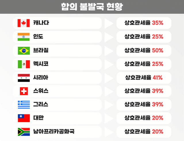 협상에 실패한 나라도 몸살을 앓긴 마찬가지다. 당장 관세 폭탄이라는 가혹한 현실에 직면한데다 국론분열 조짐까지 나타나고 있다. 실제로 브라질 등 남미 국가들은 미국에 수출하는 주요 농산물과 광물에 고율 관세가 부과되면서 수출길이 막혀 경제 전반에 심각한 타격을 입을 위기에 놓였다. 이에 협상 실패국 내부에선 '미국의 일방적인 요구를 수용할 수 없다'는 강경론과 '당장 경제가 붕괴될 수 있다'는 현실론이 팽팽하게 맞서며 극심한 분열 양상도 벌어지고 있다. 대표적인 협상 실패국으로는 △브라질 50% △시리아 41% △스위스 39% △그리스 39% △캐나다 35% △남아프리카공화국 30% △인도 25% △멕시코 25% △대만 20% 등이 있다.