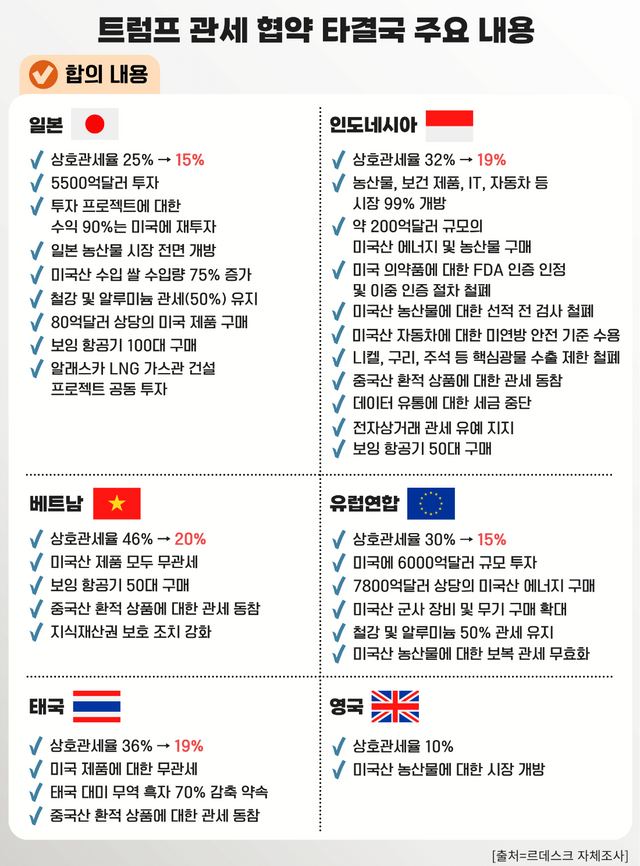 도널드 트럼프 미국 대통령의 관세인상 조치에 전 세계가 들썩이고 있다. 협상에 실패해 '관세 폭탄'을 맞은 나라는 물론 가까스로 협상에 성공한 나라에서도 막대한 경제적·외교적 부담에 대한 우려가 제기되고 있다. 특히 상호관세율을 낮추는 대가로 미국의 무리한 요구를 수용한 나라에선 반미 감정까지 생겨나는 모습이다.