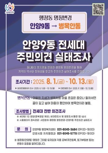 이번 주민의견 실태조사는 안양8동의 행정동 명칭을 명학동으로, 안양9동은 병목안동으로 변경하는 것에 대한 찬반 의견 조사다.