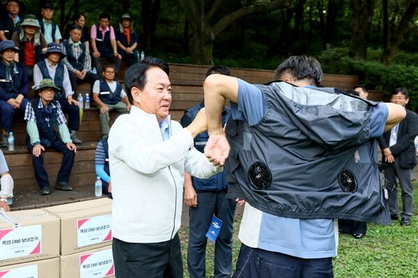 서울 서대문구(구청장 이성헌)가 폭염 속 온열질환 예방을 위해 공원·녹지 유지관리 업무를 하는 푸른도시과 소속 현업 근로자 150여명에게 '보랭 조끼'를 배부했다고 1일 밝혔다.