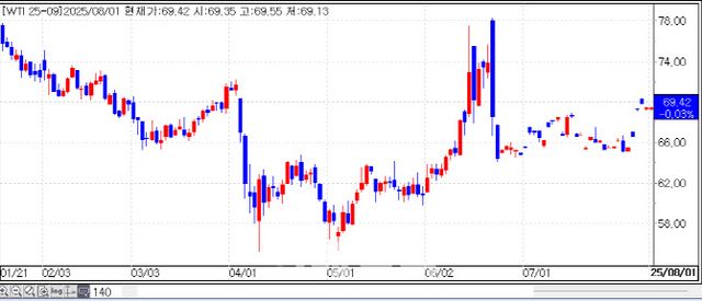 1일 금융정보업체 KG제로인 엠피닥터에 따르면 지난달 31일 서부텍사스산원유(WTI) 9월 인도분은 전거래일 대비 0.26% 오른 69.44달러에 거래를 마쳤다. 한 달 전만해도 60달러 중반대였지만 이내 상승 흐름을 이어가며 70달러를 목전에 둔 상황이다.