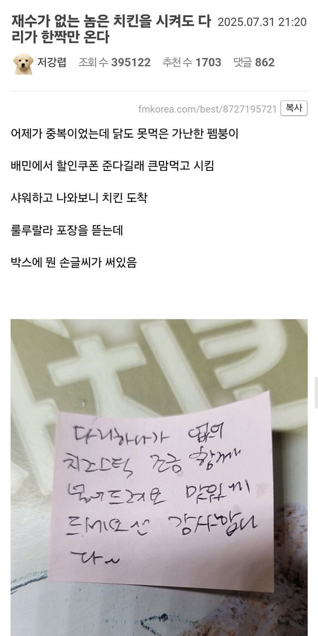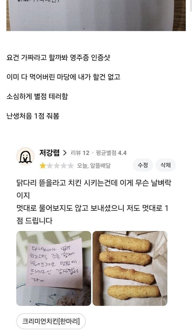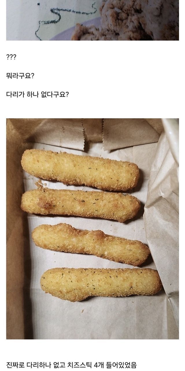 치킨시켰는데 닭다리 한개 대신 치즈스틱 4개 괜춘??