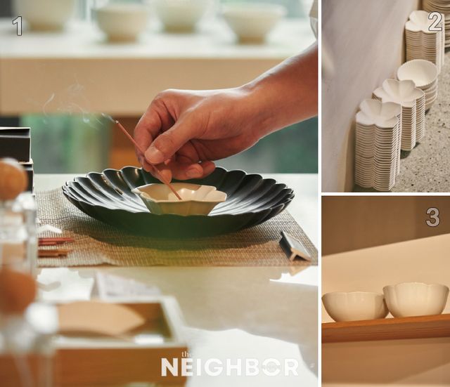 1 공간을 채우는 무자기의 인센스 스틱. 2 대표 제품인 꽃 접시와 볼. 3 새롭게 출시된 플룸 볼 밥그릇과 국그릇.