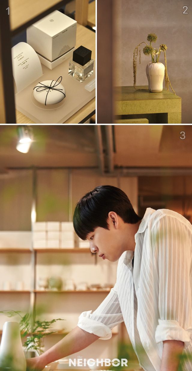 1 토아이의 오 드 퍼퓸 ‘파인드미’. 시향용 세라믹 오브제 역시 무자기 제품이다. 2 서울 역삼동의 카페 무원. 3 무자기 쇼룸에서의 심보근 도예가.