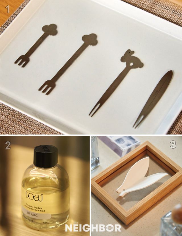 1 스테인리스로 제작한 디저트 포크. 2 토아이 디퓨저 ‘A. B. C’. 바질과 유자의 싱그러운 향을 담았다. 3 무자기의 멀티 프레이그런스와 세라믹 사셰.