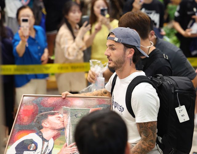 | 잉글랜드 프리미어리그 토트넘 홋스퍼 제임스 매디슨이 1일 인천국제공항 제1터미널에서 한 팬이 준비한 액자를 받아들고 청사를 나서고 있다. 사진=연합뉴스 |
