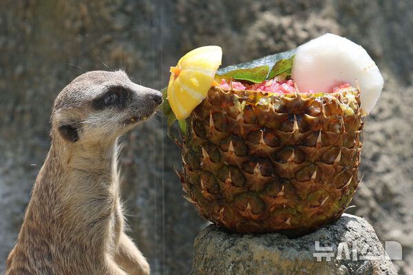 [서울=뉴시스] 폭염이 이어지고 있는 1일 경기 과천시 서울대공원 동물원에서 미어캣이 사육사들이 준비한 특식을 먹고 있다.